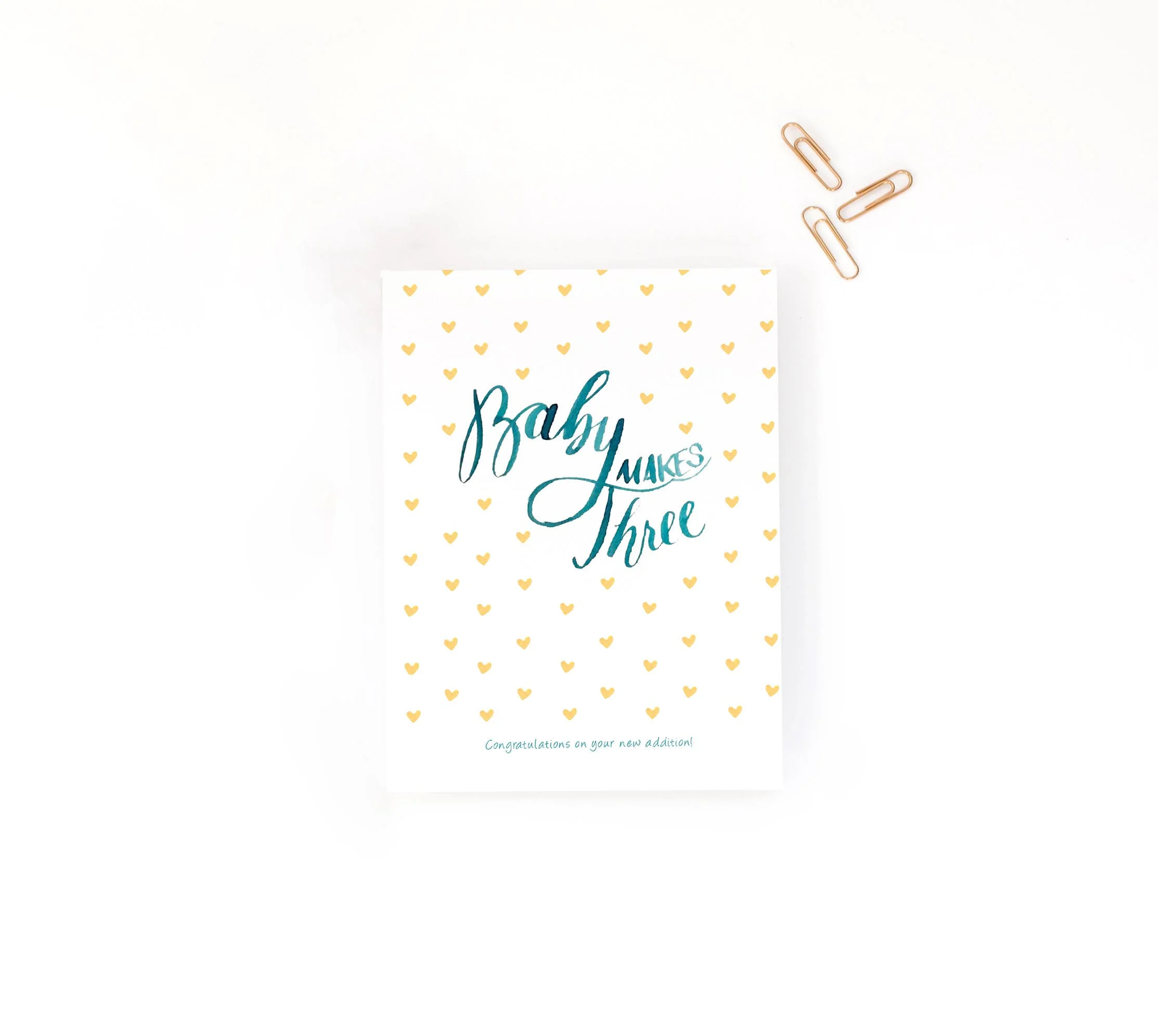 Baby Makes Three, New baby, baby shower — Greeting Cards