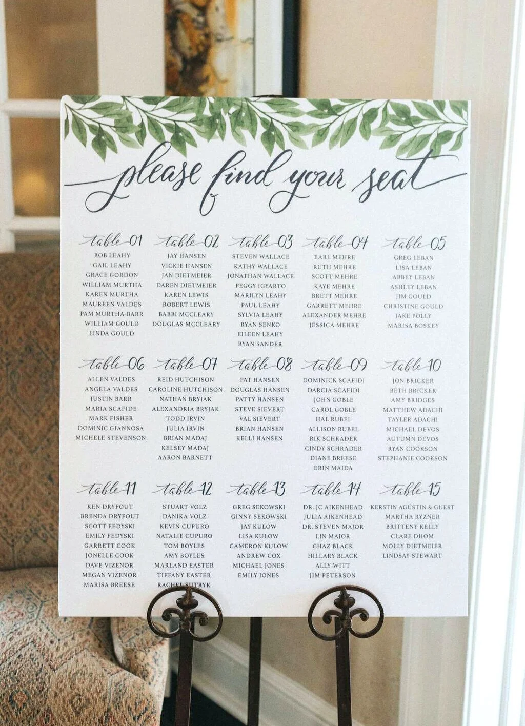 Seating Chart If you are not planning on having personal escort and/or placards, or happy to have guests sit where they like—let them know where to place their items to get the party started as soon as possible!